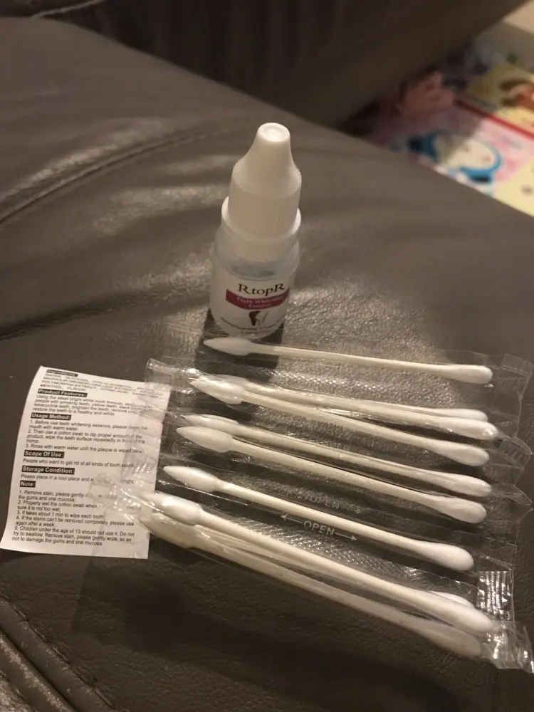 Note: 1.Remove stain, please gently wipe, so as not to damage the gums and oral mucosa.; 2.Properly wet the cotton swab when it is soaked, making sure it is not too wet; 3. It takes about 1 min to wipe each tooth; 4.If the stains can't be removed completely, please use again after a week; 5. Children under the age of 13 should not use it. Do not try to swallow. Remove stain, please gently wipe, so as not to damage the gums and oral mucosa.